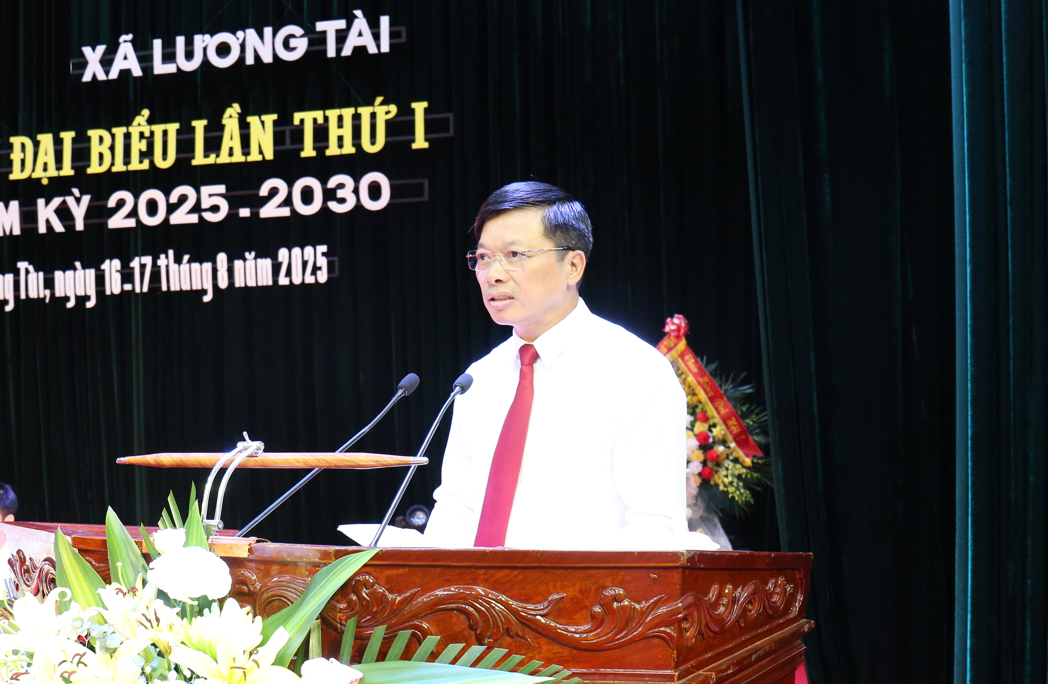 rong 02 ngày 16 - 17/8, Đảng bộ xã Lương Tài, tỉnh Bắc Ninh long trọng tổ chức Đại hội đại biểu Đảng bộ lần thứ I, nhiệm kỳ 2025 - 2030. Đồng chí Đào Quang Khải, Ủy viên Ban Thường vụ Tỉnh ủy, Phó Chủ tịch UBND tỉnh dự, phát biểu chỉ đạo Đại hội.